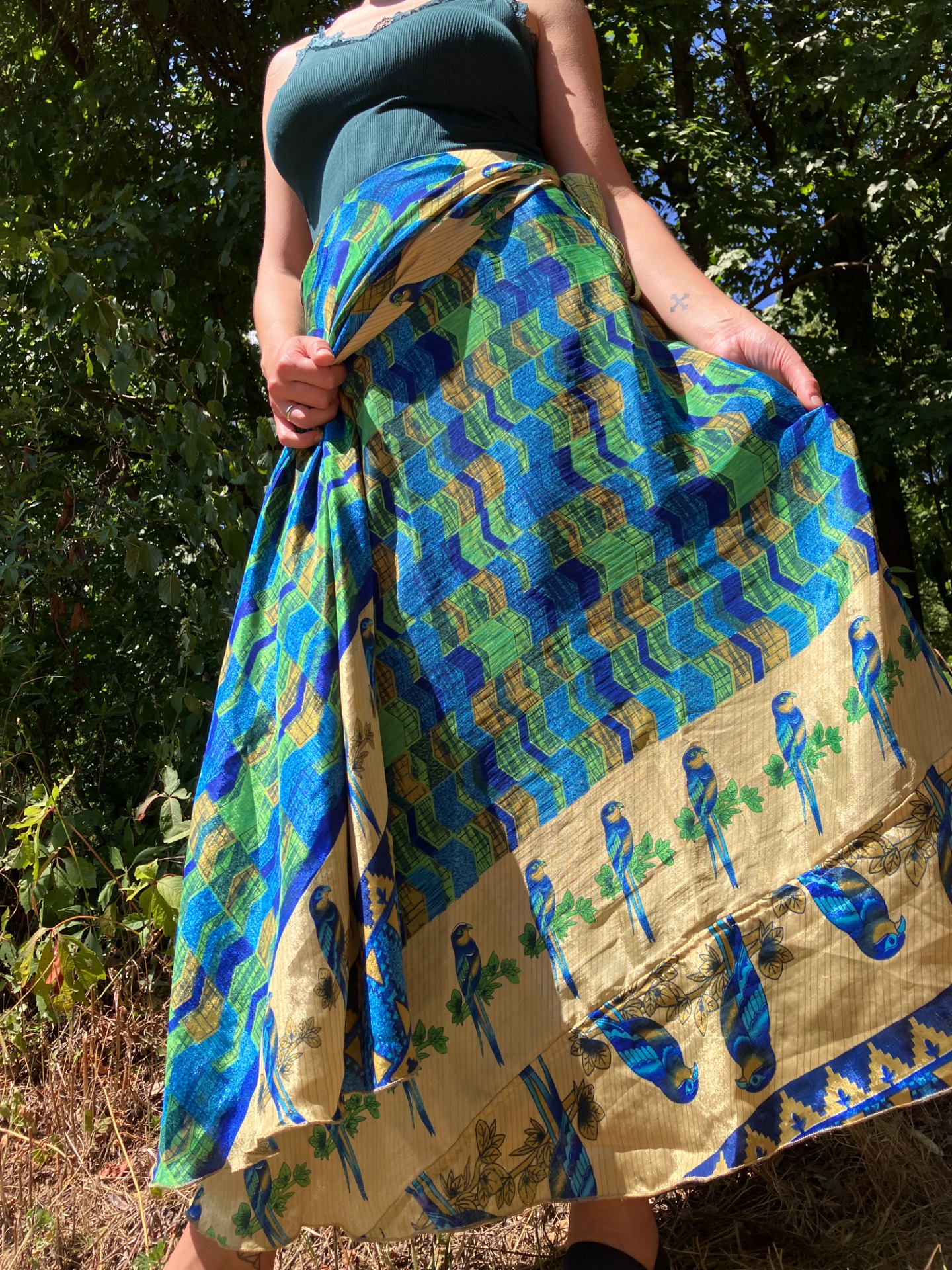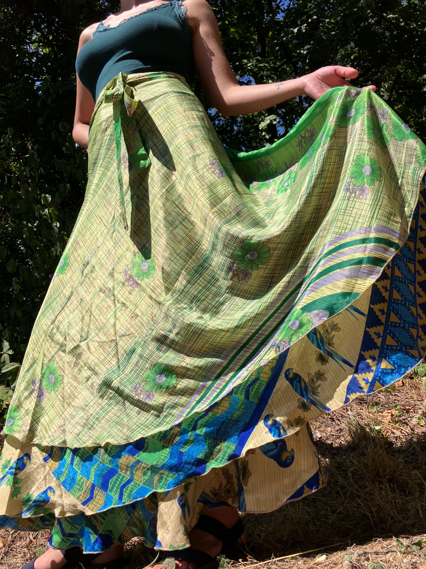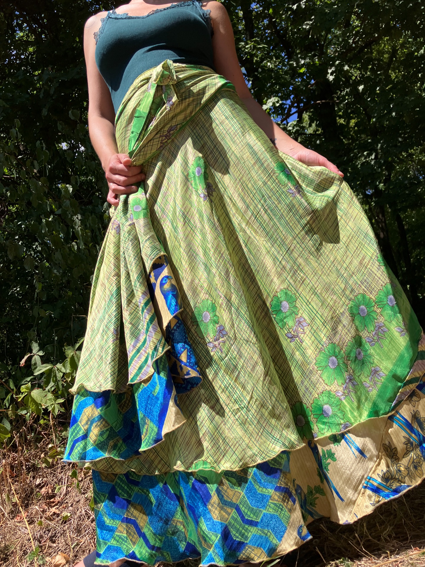 Egyedi, két rétegű, kifordítható, A-vonalú lapszoknya. Indiai szárik újrahasznosításából.