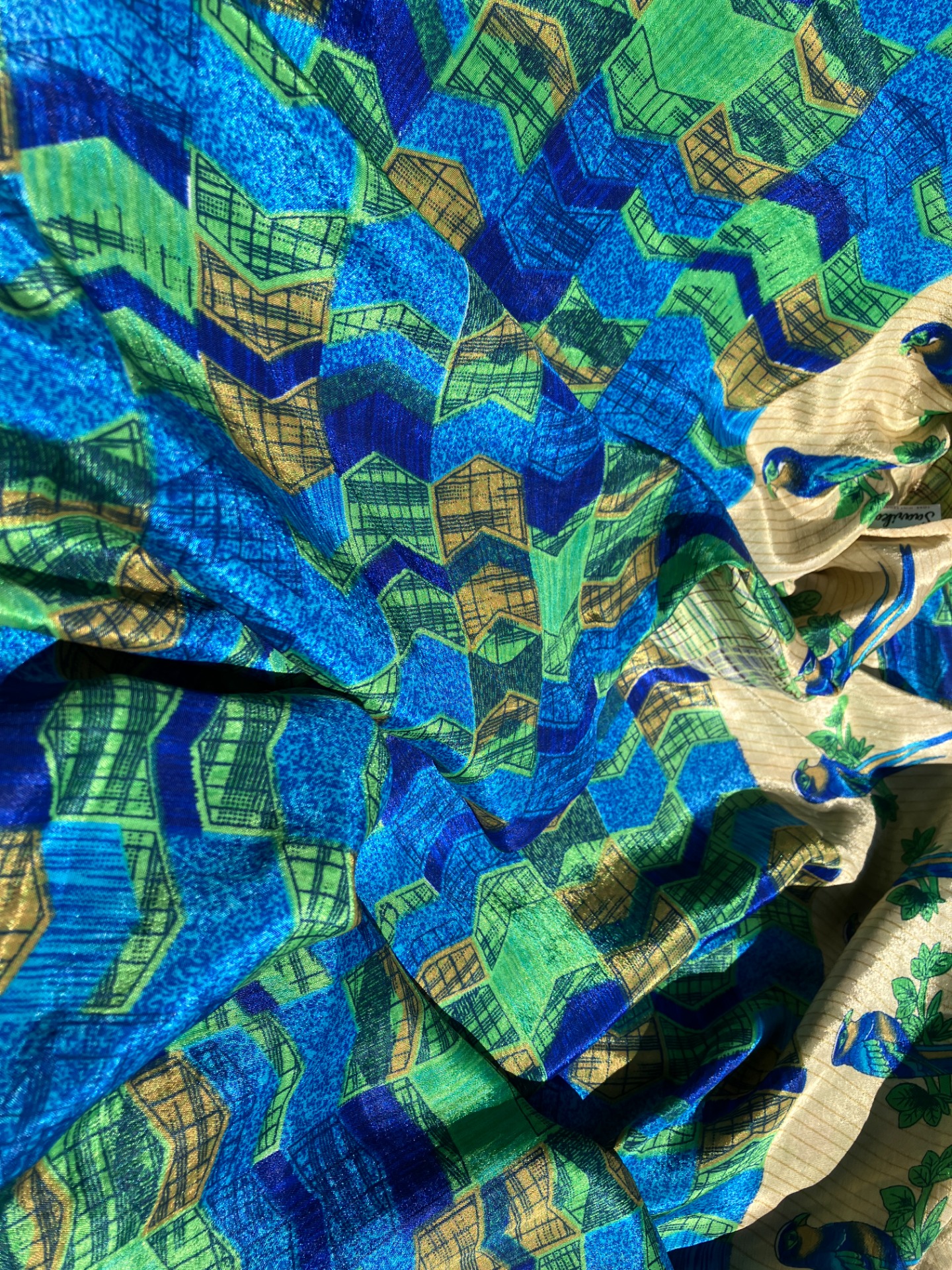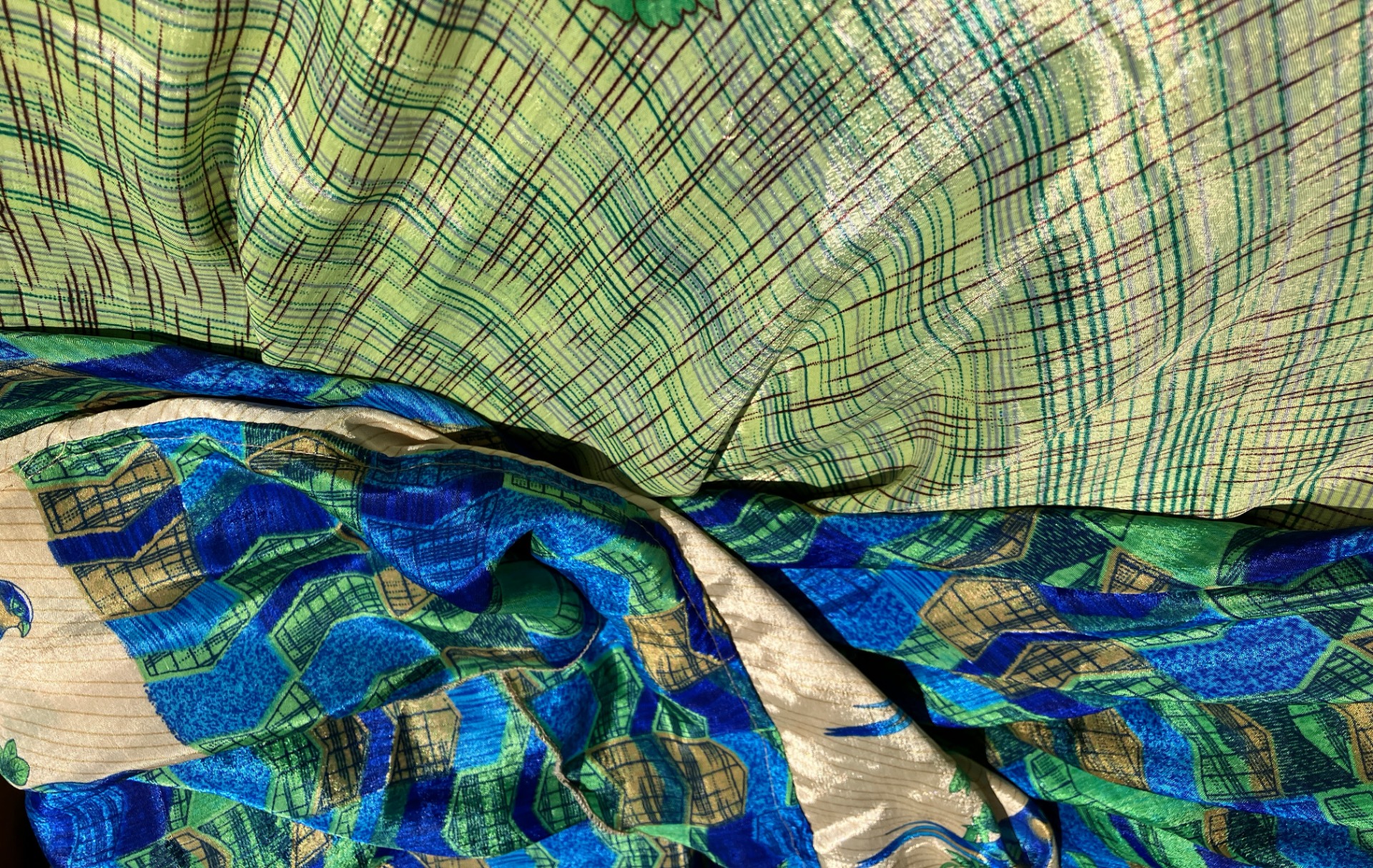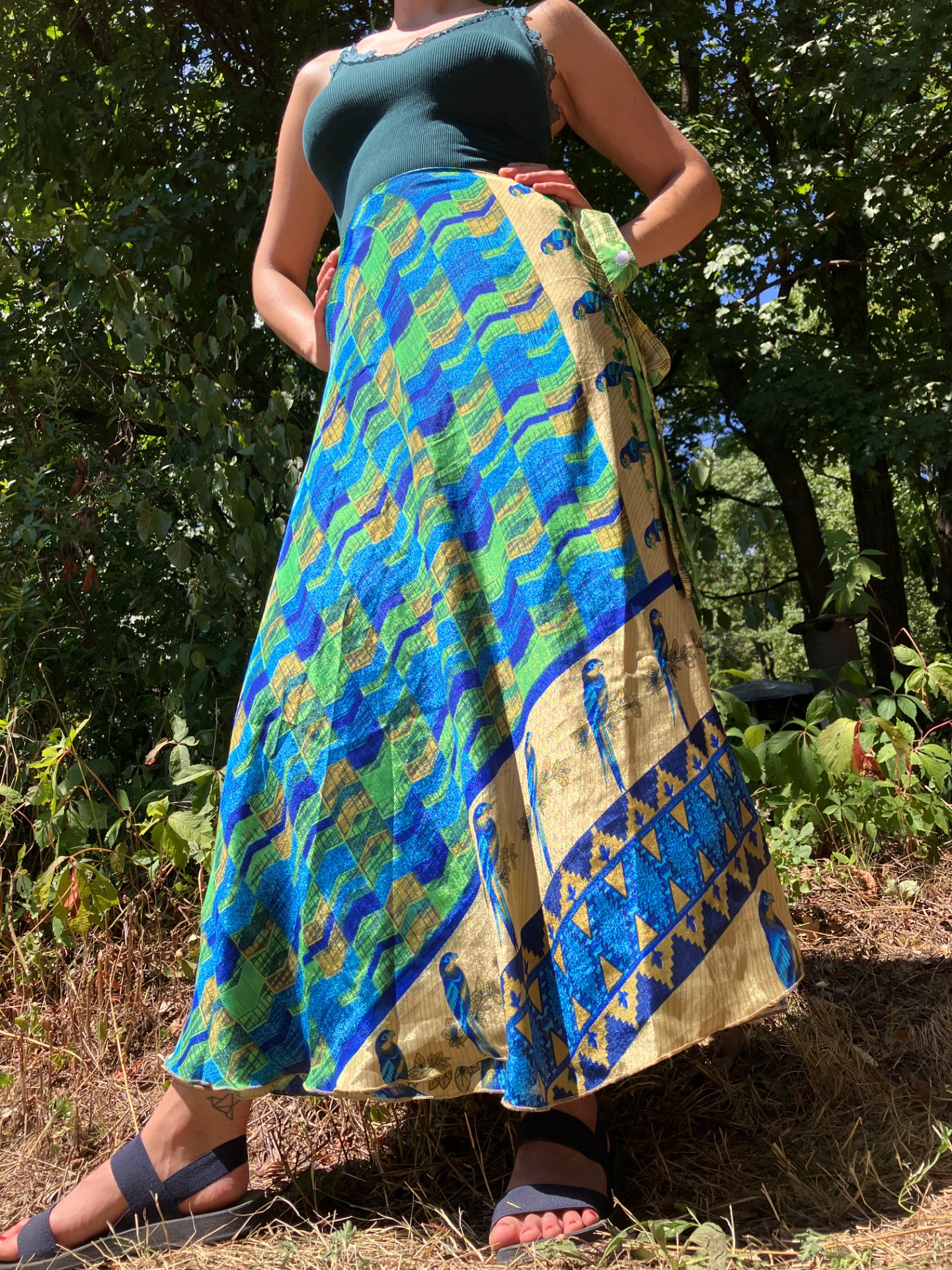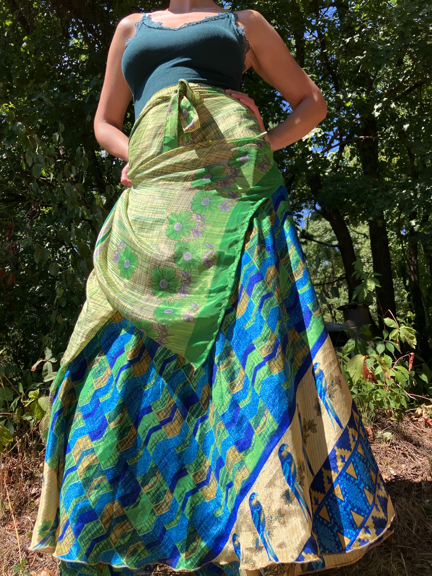 Egyedi, két rétegű, kifordítható, A-vonalú lapszoknya. Indiai szárik újrahasznosításából.